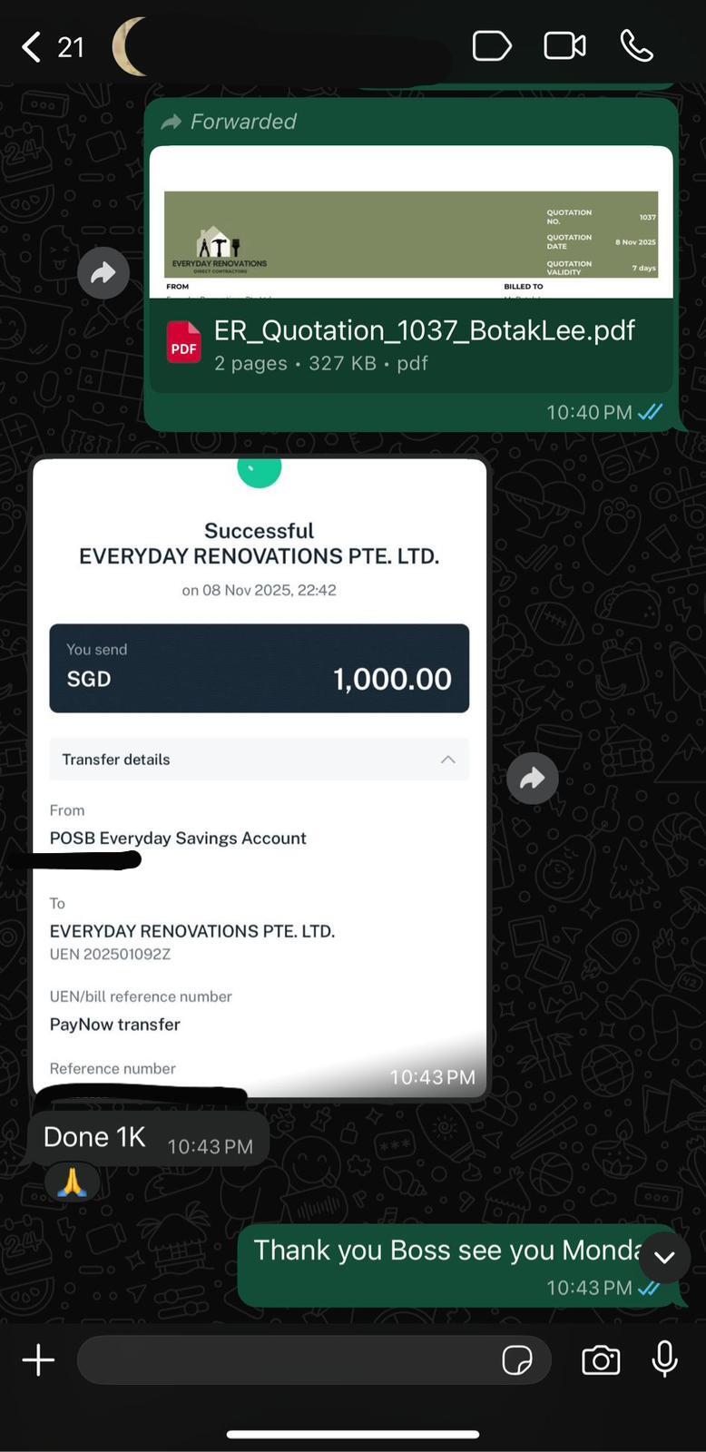 EXCELLENT Based on 46 reviews Posted on Pua PkTrustindex verifies that the original source of the review is Google. Competitive pricing and easy going. But consumers need to know what you want before signing the agreement.Posted on Ruhaya MansorTrustindex verifies that the original source of the review is Google. Excellent work by Ali and team. Vinyl flooring, electrical rewiring, painting and air conditioning services. Starting and executing the finishing job byEveryday renovationPosted on Vincent BuiTrustindex verifies that the original source of the review is Google. Replied to my enquires fast and finish the job even faster! Very happy with their service.Posted on Cheng Hiang KohTrustindex verifies that the original source of the review is Google. We are very impressed ali and his workmanrship Very skilled and very professional painting and waterproofing in my condo price quoted very reasonable we reccomend our friend to everyday renovationPosted on WM O (WMO)Trustindex verifies that the original source of the review is Google. Got my place painted recently and I’m super happy with how it turned out. Ali and team did an awesome job! clean, fast, and really detailed. They covered everything properly and left the place looking fresh and bright. The paint looks super smooth and the whole space feels new again. Really appreciate the effort and the good attitude throughout the work. Highly recommend them if you need painting or renovation help. Great job, guys! 🙌🎨Posted on Edwina WongTrustindex verifies that the original source of the review is Google. Very professional and helpful...helped to clear my unwanted stuffs. Covered up all my furniture well...very trustworthy. Will use their services again 🤩👍😄Posted on siti_rash siti_rashTrustindex verifies that the original source of the review is Google. Punctual and able to complete work within a day. Take care to cover furniture & placed back to its position. Nice outcomePosted on Saik Hoong ThamTrustindex verifies that the original source of the review is Google. The contractor is very professional and experience. They have done a good job although it is just a minor job. I'll mot hesitate to recommend to my friends anf relatives. Well done, good job.Posted on Sulaiman IshakTrustindex verifies that the original source of the review is Google. I heard about Everyday Renovations through a friend who had used their services before and we are so glad we reached out. We needed to doing our home painting & vinylflooring The paintwork and construction work with vinylfloor excellent, and the pricing was very reasonable. Highly recommended for any home renovation needs!Posted on Mani KandanTrustindex verifies that the original source of the review is Google. Fast and professional service provided for electrical and carpenter.Verified by TrustindexTrustindex verified badge is the Universal Symbol of Trust. Only the greatest companies can get the verified badge who has a review score above 4.5, based on customer reviews over the past 12 months. Read more